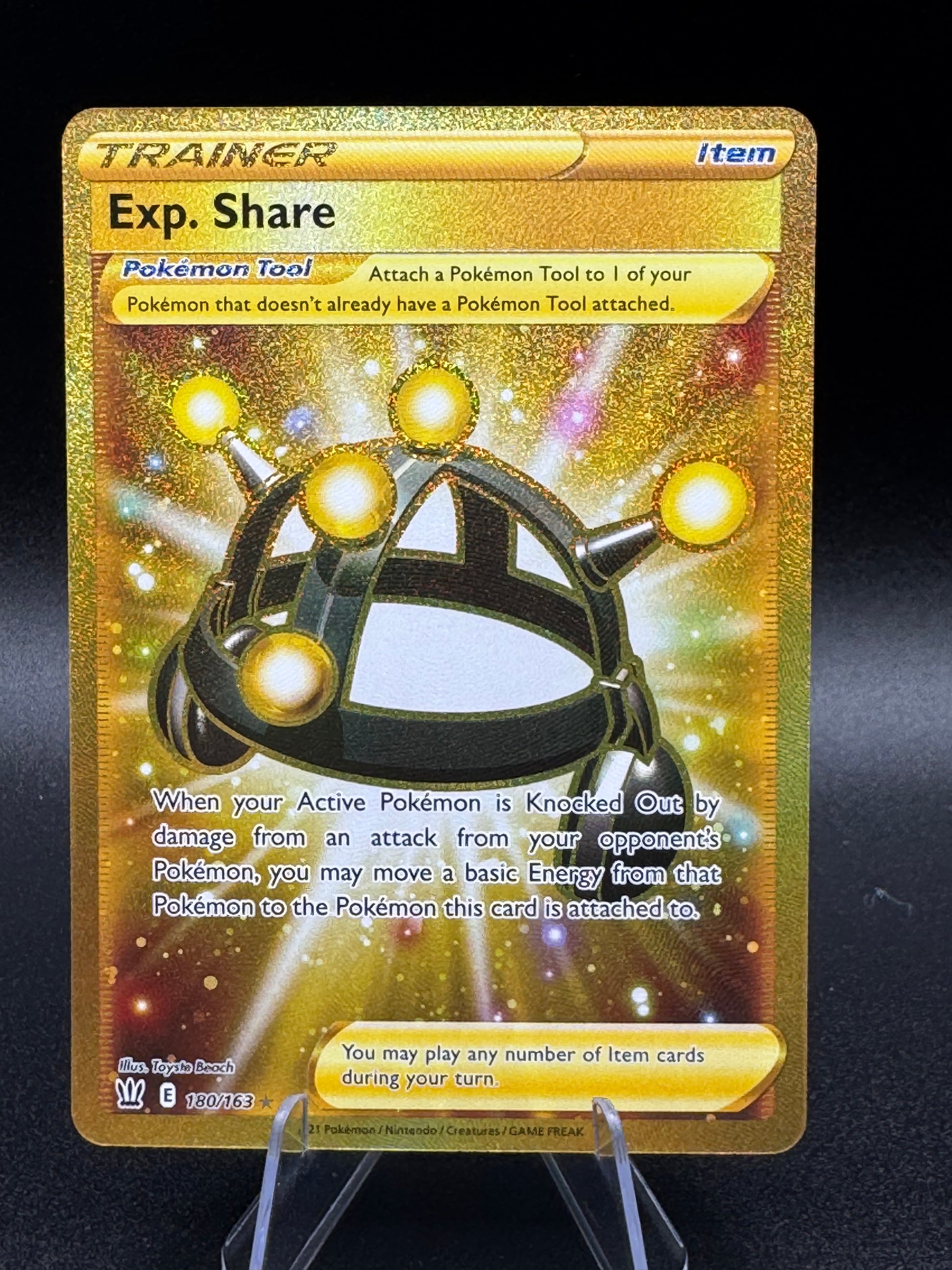 The product is a Pokémon TCG card from the Sword & Shield - Battle Styles set, featuring the Exp. Share Trainer card with a Secret Rare Holo finish. Illustrated by Toyste Beach, this English-language card is numbered 180 out of 163 in the set and manufactured by The Pokémon Company. Collectible Card Game enthusiasts and fans of the Pokémon TCG would appreciate adding this rare and powerful card to their collection to enhance their gameplay experience.