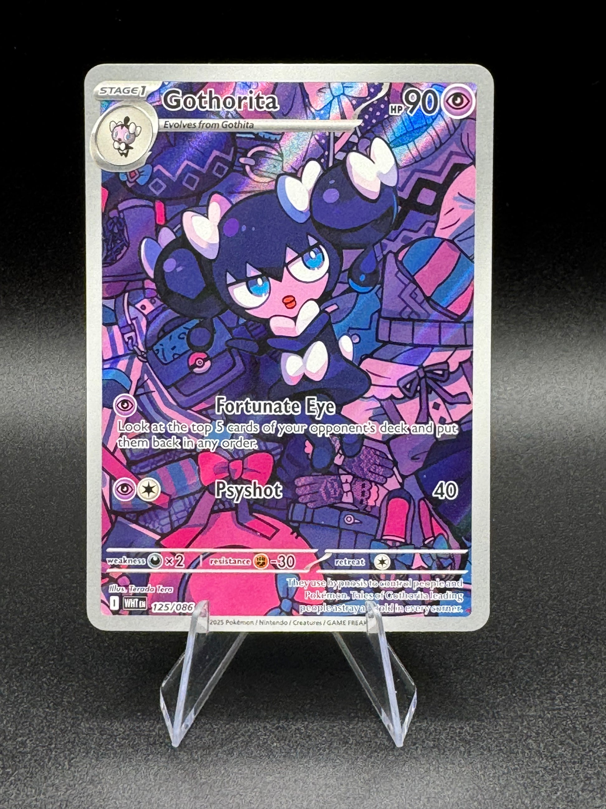 The product is a rare Pokemon TCG card featuring the character Gothorita from the Sv: White Flare set. This full art card has a White attribute, EX speciality, and a Psychic creature type. Manufactured by The Pokemon Company in Japan, the card showcases a holographic finish and is part of the Stage 1 evolution. With a card number of 125/086, this English language card is a prized collectible for fans of the Pokemon Trading Card Game.